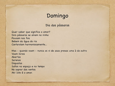 Poema do Domingo Publicado porCleonilton Souza11/05/201514/06/2020Publicado emCartões, Culturais, Senso ComumTags:Artes, linguagens, Literatura Início da Semana Descubra mais sobre Canal EPraxe Assine para receber nossas notícias mais recentes por e-mail. Digite seu e-mail… Assinar Compartilhar Clique para compartilhar no LinkedIn(abre em nova janela) LinkedIn Clique para compartilhar no Facebook(abre em nova janela) Facebook Clique para compartilhar no WhatsApp(abre em nova janela) WhatsApp Clique para enviar um link por e-mail para um amigo(abre em nova janela) E-mail Clique para imprimir(abre em nova janela) Imprimir Curtir Carregando... Relacionado Publicado por Cleonilton Souza Educador nas áreas de educação, tecnologias e linguagens. Ver mais posts