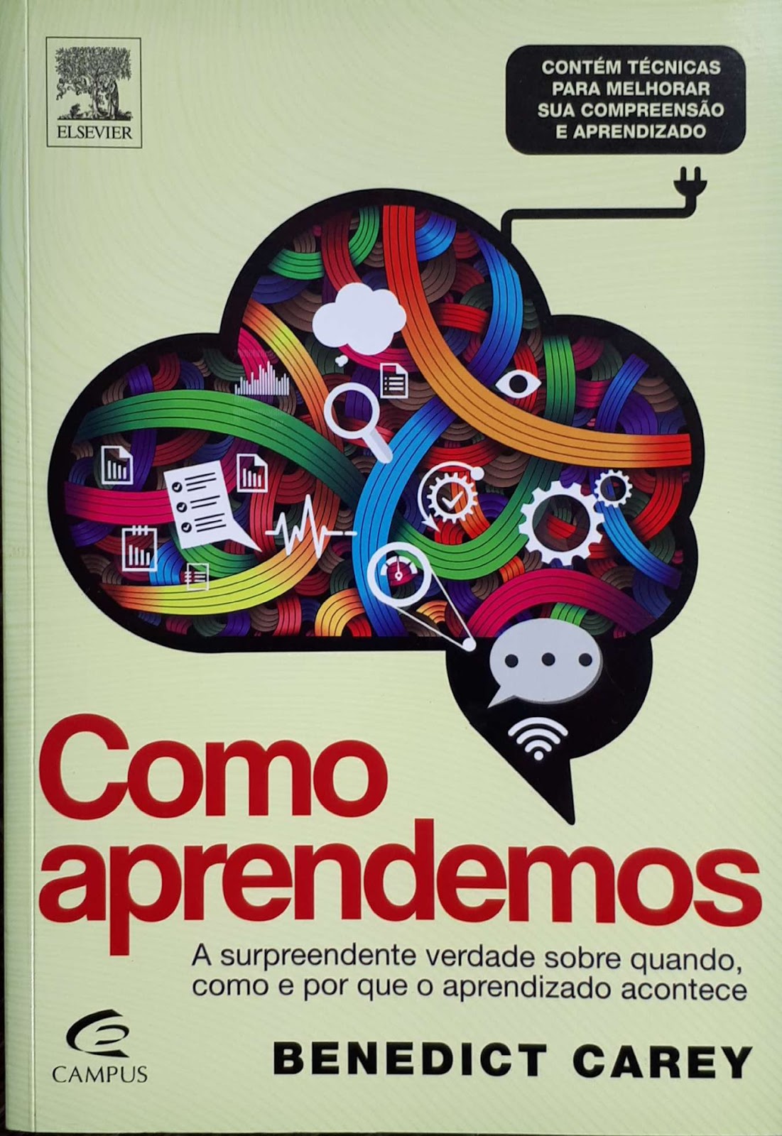 - Como aprendemos – a surpreendente verdade sobre quando, como e por que o aprendizado ocorre, de Benedict Carey essa imagem que ora se parece com um cérebro, ora se parece como um balão de fala, impressiona. Ainda há o multicolorido que compõe o interior da figura, cheia de intricados elementos que suscitam aprendizagem.