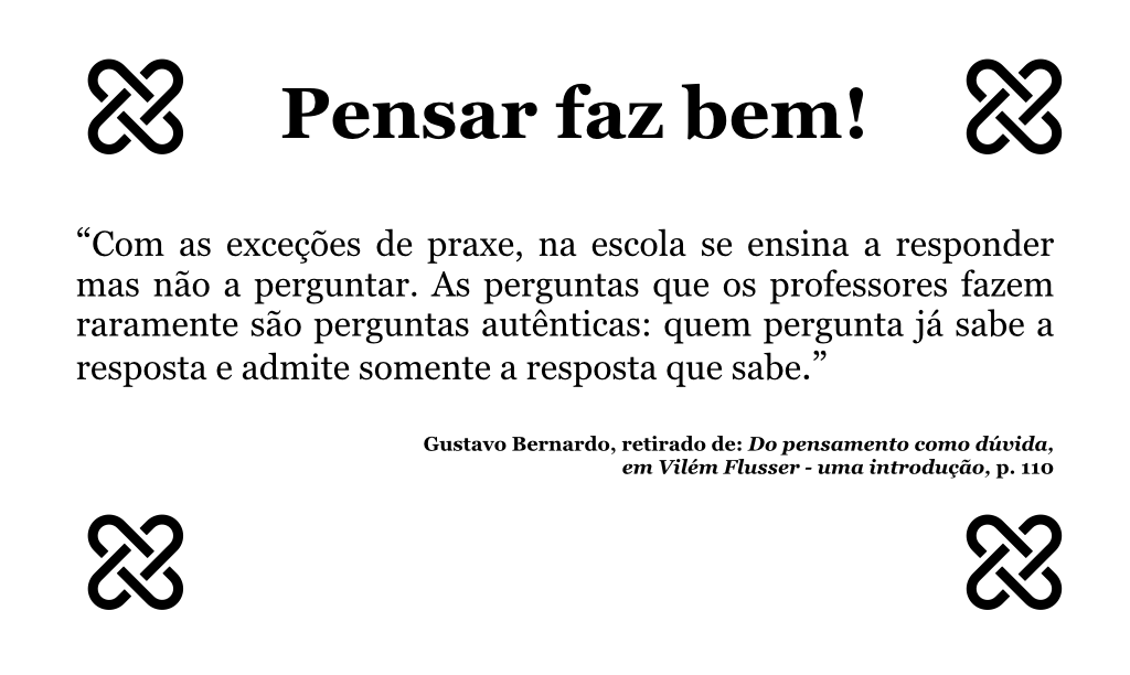 Pensar faz bem – Gustavo Bernardo Publicado porCleonilton Souza08/04/202202/04/2022Publicado emCartõesTags:Filosofia, Gustavo Bernardo, Pensamento Pensar faz bem – Gustavo Bernardo Trabalho licenciado com Creative Commons ***Pesquisar Leia+Cinema Cultura TrabalhoEducação Comunicação Tecnologia Orcid de Cleonilton Souza Descubra mais sobre Canal EPraxe Assine para receber nossas notícias mais recentes por e-mail. Digite seu e-mail… Assinar Compartilhar Clique para compartilhar no LinkedIn(abre em nova janela) LinkedIn Clique para compartilhar no Facebook(abre em nova janela) Facebook Clique para compartilhar no WhatsApp(abre em nova janela) WhatsApp Clique para enviar um link por e-mail para um amigo(abre em nova janela) E-mail Clique para imprimir(abre em nova janela) Imprimir Curtir Carregando... Publicado por Cleonilton Souza Educador nas áreas de educação, tecnologias e linguagens. Ver mais posts