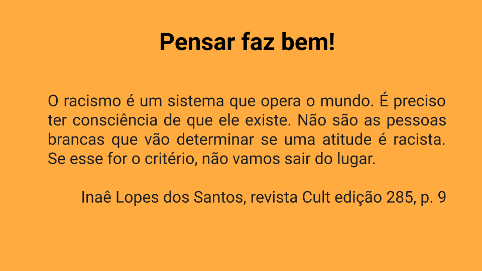 Pensar faz bem com Inaê Lopes Publicado porCleonilton Souza19/12/202226/11/2022Publicado emCartõesTags:Inaê Lopes dos Santos, Pensamento, Racismo Pensar faz bem com Inaê Lopes. Criação EPraxe Licenciado com Creative Commons - ***Pesquisar Leia+Cinema Cultura TrabalhoEducação Comunicação Tecnologia Orcid de Cleonilton Souza Descubra mais sobre Canal EPraxe Assine para receber nossas notícias mais recentes por e-mail. Digite seu e-mail… Assinar Compartilhar Clique para compartilhar no LinkedIn(abre em nova janela) LinkedIn Clique para compartilhar no Facebook(abre em nova janela) Facebook Clique para compartilhar no WhatsApp(abre em nova janela) WhatsApp Clique para enviar um link por e-mail para um amigo(abre em nova janela) E-mail Clique para imprimir(abre em nova janela) Imprimir Curtir Carregando... Relacionado Publicado por Cleonilton Souza Educador nas áreas de educação, tecnologias e linguagens. Ver mais posts