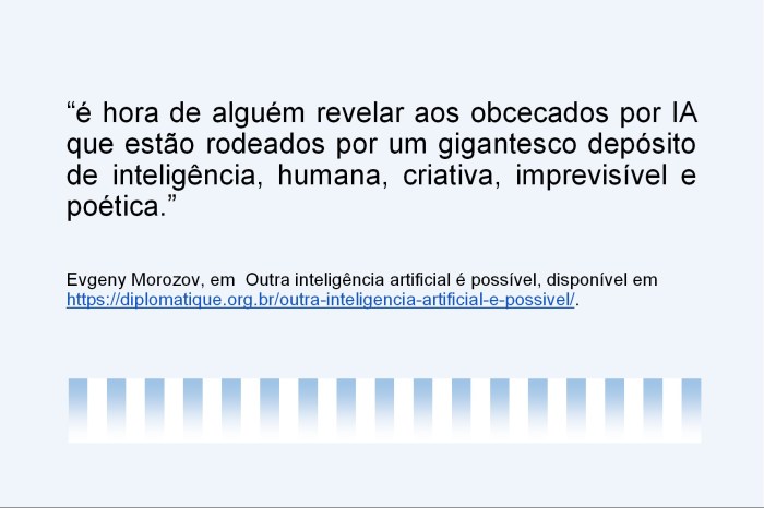 A seção Pensar faz bem! traz para os leitores reflexões de diversas áreas do saber, vinculados à cultura e ao cotidiano. Uma parte significativa dos textos Pensar faz bem! é fruto das leituras que fazemos para construção dos artigos, crônicas e resenhas aqui publicados. O pensamento da quinzena é de Evgeny Morozov