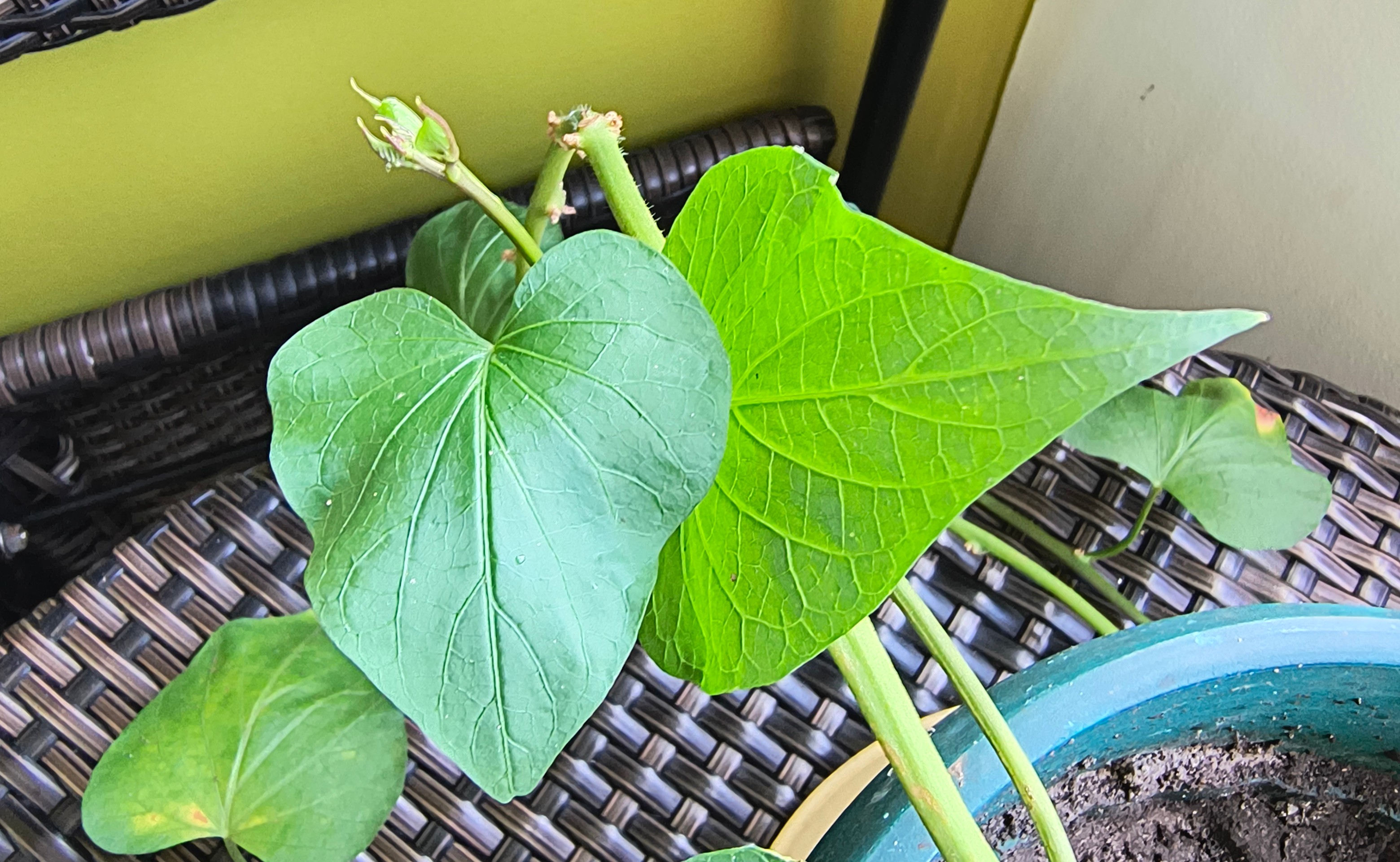 Mas nem só de melancolias vive o humano. Dias desses comprei uma raiz de batata doce, daquelas cuja casca é avermelhada, e para minha surpresa, alguns dias depois daquela pequena raiz estava florescendo uma planta muito bela, aos meus olhos de melancolia, é claro.